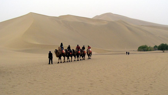敦煌鳴沙山位于甘肅省敦煌市南五公里處巴丹吉林沙漠和塔克拉瑪干沙漠的過渡地帶。沙峰起伏,人們順坡滑落,便會(huì)發(fā)出轟鳴聲,稱為“沙嶺晴鳴”,為敦煌八景之一。