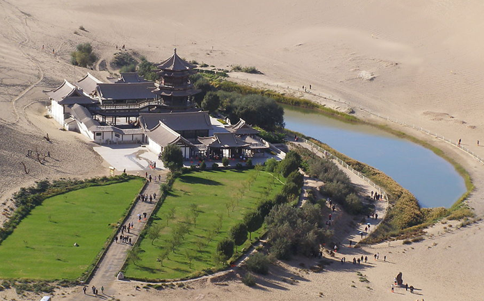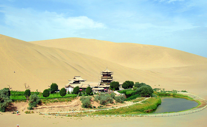 五十年代測量,月牙泉東西長218米,中斷最寬處54米,平均水深5米,最深處7米余。南岸原有廟宇百余間,但十年動亂中焚毀,農(nóng)業(yè)大躍進時又抽水灌田導致池面嚴重縮小。近年修復古建、掏泉疏水、治沙綠化,才有今天面貌。臺灣易經(jīng)研究專家張淵量博士1993年游河西時根據(jù)易經(jīng)、易理考證認定月牙泉即王母娘娘蟠桃盛會之瑤池也,信否隨意。