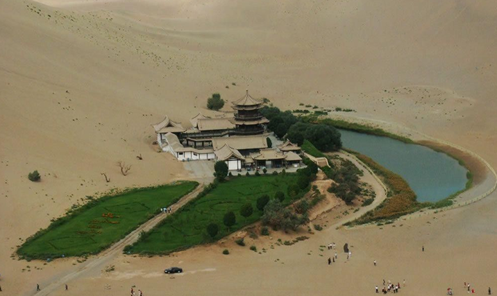 月牙泉位于敦煌市西南5公里處,是一處神奇的漫漫沙漠中的湖水奇觀。鳴沙山下,泉水形成一湖,在沙丘環(huán)抱之中,酷似一彎新月而得名月牙泉。月牙泉,古稱沙井,俗名藥泉,泉邊蘆葦叢生,水中魚兒自在,胡楊沙棗綠樹成蔭,羅布麻、枸杞等藥用植物豐茂,亭臺樓榭古香古色,春夏季節(jié)百花盛開,夏秋季節(jié)梨果飄香。自漢朝起即為“敦煌八景”之一,得名“月泉曉徹”。月牙泉南北長近100米,東西寬約25米,泉水東深西淺,最深處約5米,彎曲如新月,因而得名。一灣清泉,漣漪縈回,碧如翡翠。泉在流沙中,干旱不枯竭,風吹沙不落,蔚為奇觀。歷代文人學士對這一獨特的山泉地貌、沙漠奇觀稱贊不已。月牙泉因“泉映月而無塵”、“亙古沙不填泉,泉不涸竭”而成為奇觀。“晴空萬里蔚蘭天,美絕人寰月牙泉,銀山四面沙環(huán)抱,一池清水綠漪漣”。 月牙泉有四奇:月牙之形千古如舊、惡境之地清流成泉、沙山之中不淹于沙、古潭老魚食之不老。版權(quán)所有山東聊城聊之旅國際旅行社有限公司,轉(zhuǎn)載必究!去鳴沙山月牙泉游玩以傍晚、黃昏時分最佳。月牙泉有三寶:鐵背魚、五色沙、七星草,傳說鐵背魚和七星草一起吃可以長生不老!月牙泉南岸的小花羅布紅麻是泉邊獨特而唯一的保健中草藥,也有延緩衰老的功效,每年6,7,8月小花盛開,猶如夜幕中的點點繁星,版權(quán)所有山東聊城聊之旅國際旅行社有限公司,轉(zhuǎn)載必究!根據(jù)老輩人的說法:敦煌特有的狗魚也許就是鐵背魚,月牙泉南岸的羅布麻或許就是傳說的七星草! 月牙泉處于鳴沙山環(huán)抱之中,面積 0.88公頃,平均水深3米左右,水質(zhì)甘冽,清澈如鏡。千百年來沙山環(huán)泉而不被掩埋,地處干旱沙漠而泉水不濁不涸,實數(shù)罕見。泉內(nèi)星草含芒、鐵魚鼓浪,山色水光相映成趣,風光十分優(yōu)美。