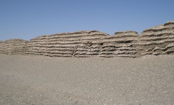 敦煌漢塞沿疏勒河南岸,由東向西延伸。西漢的塞墻止于疏勒河下游榆樹泉盆地東側(cè)的馬迷兔,在現(xiàn)敦煌市境內(nèi)長(zhǎng)約 145公里,其間有大、小方盤城和馬圈灣等烽燧遺址,一般保存較好。塞墻構(gòu)筑多因地制宜,就地取材。在湖灘、沼澤地區(qū),塞墻多先以蘆葦束作框架,內(nèi)填砂礫,再平鋪蘆葦層,如此層層疊壓而上,底寬約 3米,頂寬約1.5米,現(xiàn)存最高者約3.75米。戈壁地區(qū)多產(chǎn)紅柳,則以紅柳枝束為框架,筑法與蘆葦作材料者相同。
