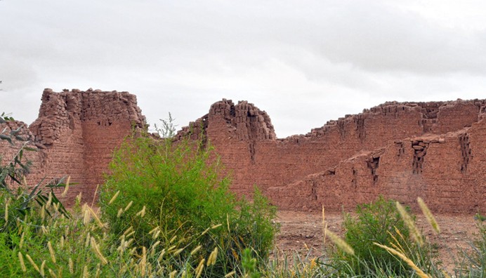 大方盤城(斯坦因編號(hào)T18) 位于小方盤城東北約11公里,北距疏勒河 1.2公里,漢代倉(cāng)儲(chǔ)遺址。平面呈長(zhǎng)方形,東西長(zhǎng) 134.8米,南北寬18米,有內(nèi)外兩重圍墻。殘墻最高 7.6米。內(nèi)有倉(cāng)庫(kù)三間,南北墻上下各有一排對(duì)稱的三角形通風(fēng)孔。倉(cāng)庫(kù)內(nèi)外及其附近曾出土漢簡(jiǎn)和西晉泰始十一年 (275)刻石。
