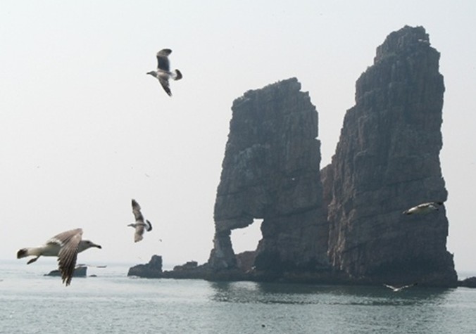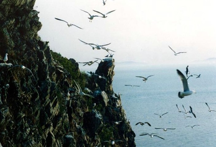 萬鳥島坐落于長島諸島中部偏東,這個海拔73.5米、僅有0.05平方公里的小島,在浩渺的汪洋大海之中,簡直是一粒微不足道的沙粒,然而海深魅力大,島小情趣多,因島上棲居著幾萬只黑尾鷗、海鸕鶿、白腰雨燕等海鳥,后稱萬鳥島。海岸地貌懸崖陡壁占90%以上,斷崖系石英巖與板巖互層,節(jié)理發(fā)育,破碎性強,經(jīng)千百年風(fēng)化和海蝕,崖壁此凸彼凹,石階、石臺、石窟、石穴鱗次櫛比,形成一座自然的“海鷗石樓”。每年四、五月間,成千上萬只海鷗在此安家,覓食、嬉戲、休憩、生兒育女。這時的小島變成了喧囂的鳥國、沸騰的劇場、海鷗的天堂。