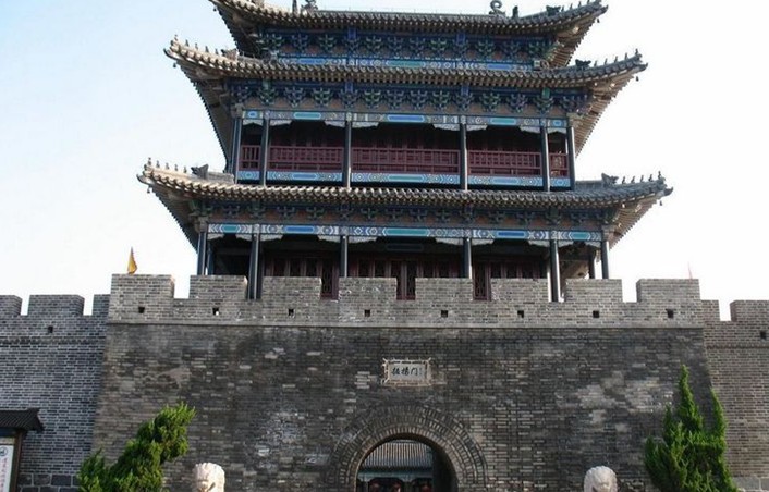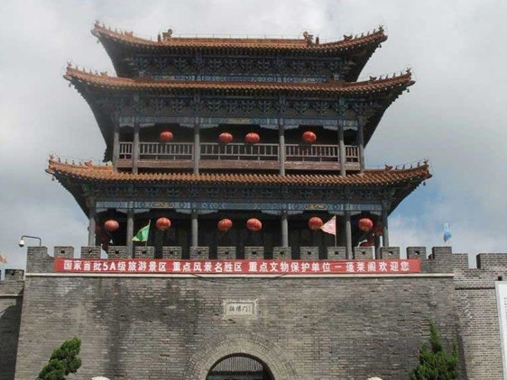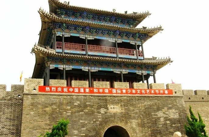 1987年修復(fù),門洞拱頂,寬3米,高5.3米,進深13.75米,門洞上方嵌“振揚門”匾額,字為吳作人手筆。門樓為兩層閣樓,外觀三層飛檐(俗稱“三滴水”),屋面開山,覆琉璃瓦,脊置六獸,檐角下系風(fēng)鈴,門樓四周為明廊,一層底面與城墻齊高,南北明廊外側(cè)為城堞,二層重檐,明廊柱間有木欄環(huán)繞。振揚門兩側(cè)各修復(fù)城墻約50米,門前建有5000平方米廣場。自1989年始,每年的蓬萊經(jīng)貿(mào)懇談會開幕式均在此舉行。1991年世界旅游日登州古市慶典活動亦在此舉行迎賓儀式。