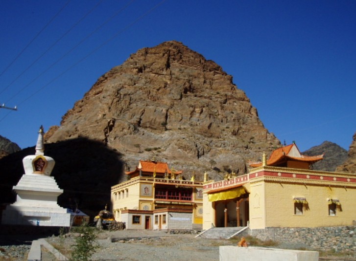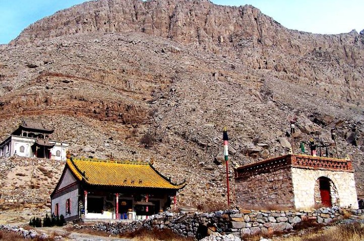 阿貴廟位于蹬口縣沙金套海蘇木境內(nèi)的狼山山脈中,坐落在漢代古城雞鹿塞西邊的溝內(nèi),是內(nèi)蒙古地區(qū)紅教喇嘛的唯一寺廟。蒙古語(yǔ)意為有山洞的廟。占地1500畝。清朝定名為“宗乘寺”。為典型藏式建筑,順山勢(shì)建成大雄寶殿及陪殿,共981間。阿貴廟奉其創(chuàng)始人印度僧蓮花生為祖師。