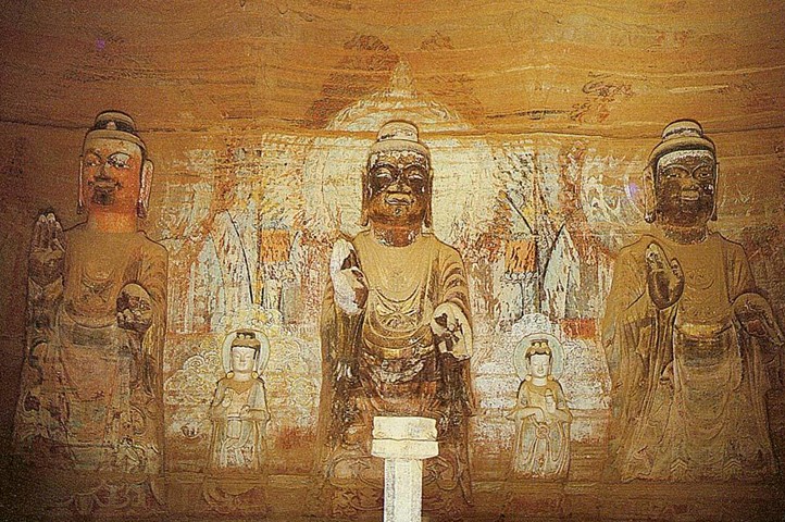 令人贊嘆的是那些高大的佛像。165窟內(nèi)正壁和左右壁雕鑿八米高的七尊立佛。這七尊佛像面相方圓,嘴唇厚重,兩耳垂肩,體魄雄健,帶著北方少數(shù)民族氣質(zhì)特徵。而在前壁兩邊雕鑿有五.八米高的兩身交腳菩薩;同時(shí)佛與佛之間還雕鑿有四米高的脅侍菩薩十身;窟門(mén)內(nèi)南北兩側(cè)雕鑿有三.○五米高的乘象菩薩和三.一米高的三頭四臂阿修羅天造像,所有的造像無(wú)不表現(xiàn)出北魏時(shí)期的北方少數(shù)民族特色。