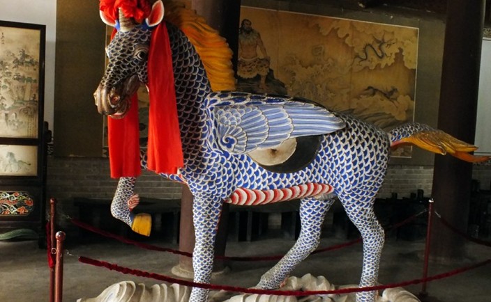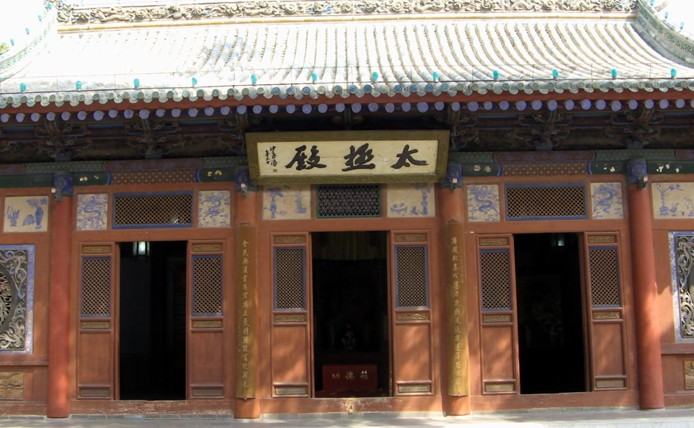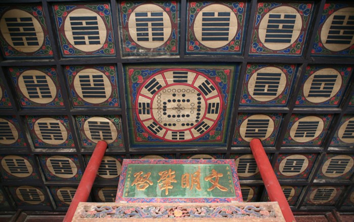先天殿在中院月臺的當(dāng)間部位。此殿異常宏大壯觀??粗岣吡杩?、莊重威嚴(yán)的風(fēng)格,游人往往嘖嘖贊嘆。這座大殿通高二十六點七米,縱深十三點五米,面寬七間,通長二十六點四米,是一座典型的明代風(fēng)格建筑。殿頂上覆琉璃簡瓦,正脊兩端亦施龍吻,垂脊、戧脊 施螭獸仙人。正脊中有橋亭火珠,脊面乃飾纏枝牡丹。其奇巧精致,耐人尋味。這座宮殿的門窗雕飾工藝,堪為上選藝術(shù)品,往往吸引不少游人,版權(quán)所有山東聊城聊之旅國際旅行社有限公司,轉(zhuǎn)載必究!由于為其精美的工藝所傾倒,而總是流連忘返。這些門窗,全系木質(zhì)結(jié)構(gòu),上面鏤刻雕飾有金錢、艾葉、仙鶴、孔雀、蝙蝠、蝴蝶,還有二龍戲珠、鹿宿松下等圖案,花紋細(xì)密,栩栩如生,有很高的欣賞價值。入大殿內(nèi),即見一中心方柱似的神龕,這便是供奉伏羲塑像的地方。完高五米有余,上根懸掛"文明肇啟"匾額,系清代嘉慶年間秦州牧王賜均所書。匾文是對伏羲始創(chuàng)八卦、教民克愚的巨大功績的高度贊頌。