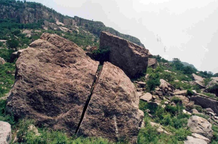 據(jù)地質(zhì)專家初步考證認為:這種崩塌現(xiàn)象是300年前發(fā)生的郯城大地震引發(fā)了此處的大山崩而造成的。站在巨石之上,閉目凝神,300年前那山崩地裂的轟鳴聲仿佛仍然在耳畔回響。傳說山腳下曾有一個小村莊在一夜之間被巨石淹沒,除了一位外出遛鄉(xiāng)的貨郎和一只躲在地窖里的貓幸免于難外,其他生靈全部葬身石下。