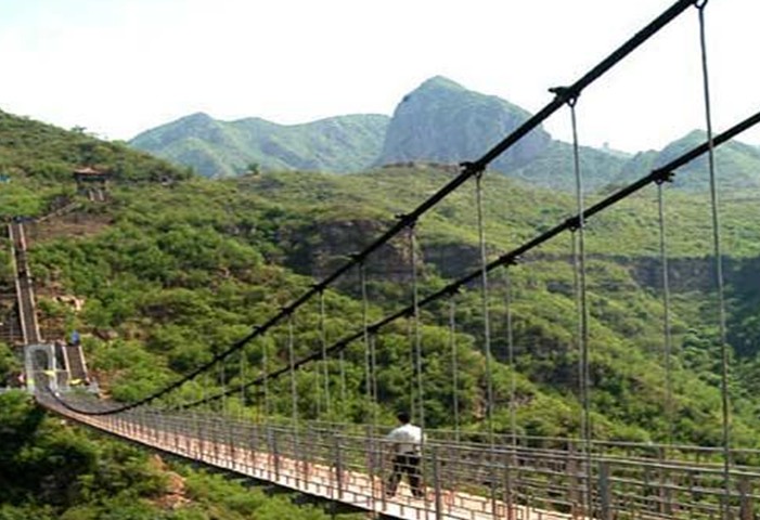 過了孝子祠,梓童湖如一面明鏡呈現(xiàn)在人們面前,在湖水上空架設(shè)了一座獨特的連接孝子祠與鬼谷祠的鐵索木橋,該橋全長50余米,寬2米有余,跨離水面10余米的兩岸懸崖之間,地部整齊地齊地橫臥5條大鐵鏈,上鋪木板,兩側(cè)設(shè)有固定拉鏈扶手,人行走在橋上好像步入顫悠悠、輕飄飄的云霧之中,思維升華,如登仙境。
