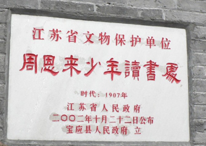 周恩來少年讀書處位于江蘇省寶應(yīng)縣城縣南街水巷口3號,原為周恩來同志的外祖父陳沅的宅第,整個建筑為清代風(fēng)格,分東西兩個院落,共十八間房屋,建筑面積500平方米,占地面積700多平方米。1996年寶應(yīng)縣政府組織全面修繕,恢復(fù)原貌,1998年3月5日周恩來同志誕辰100周年正式對外開放。