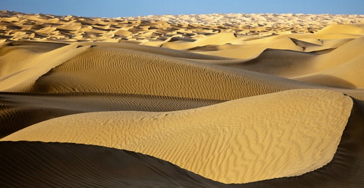 位于中國新疆的塔里木盆地中央,是中國最大的沙漠,也是世界第二大沙漠,同時還是是世界最大的流動性沙漠。整個沙漠東西長約1000公里,南北寬約400公里,面積達33萬平方公里。平均年降水不超過100毫米,最低只有四五毫米;而平均蒸發(fā)量高達2500—3400毫米。這里,金字塔形的沙丘屹立于平原以上300米。狂風能將沙墻吹起,高度可達其3倍。沙漠里沙丘綿延,受風的影響,沙丘時常移動。沙漠里亦有少量的植物,其根系異常發(fā)達,超過地上部分的幾十倍乃至上百倍,以便汲取地下的水份;那里的動物有夏眠的現象。