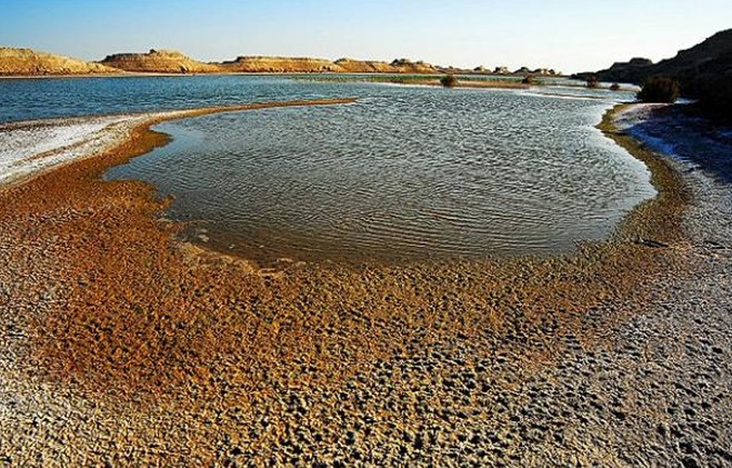 羅布泊“地下死海”主要分布在東北部的涸湖盆地底,表面是堅(jiān)硬的鹽殼,當(dāng)挖一個(gè)2m米深的洞穴后,就可看見“地下死海”的真面目。用棍棒觸攪穴中水后,提離水面都會(huì)結(jié)上一層白色的鹽晶體。與死海不同的是,這里的水深藏在巖石或土層縫隙中,鑿開一洞穴后,水就嘩嘩涌集一起。