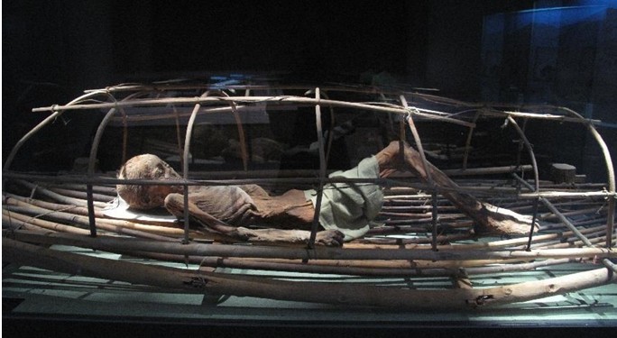 其中吐魯番地區(qū)出土古尸陳列廳是最具神秘性和吸引力的展廳。這里展出的11具干尸,從春秋戰(zhàn)國時期至清代時期的古尸,主要出自阿斯塔那—哈拉和卓墓葬群和蘇巴什古墓群、洋海古墓群等。