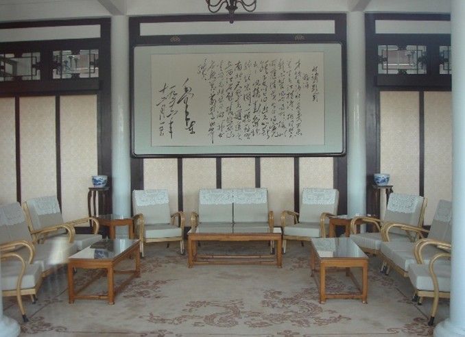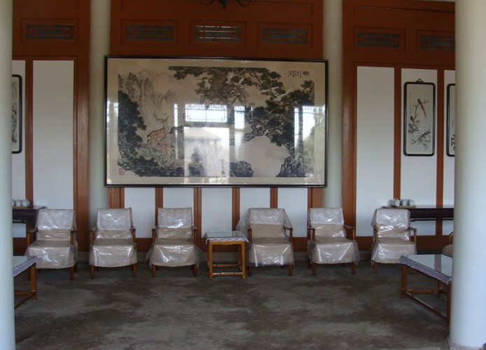 前客廳一共有五間房屋。靠東靠西的各一間用布簾與中間相隔,使中間三間室內(nèi)顯得靜謐祥和。周恩來接見外賓、會見客人等均在這中間三間房里舉行,周恩來一般坐在東邊主席位置上,西邊是主要客人的客席座位,會見時如用翻譯,就在后邊加上兩把椅子和一只小茶幾就行了。兩側(cè)是主要陪同人員坐位,如果隨行陪同人員太多,也可以臨時多放幾把椅子。周恩來在建國初期曾在這里會見原蘇聯(lián)駐中國大使羅申,原印尼總統(tǒng)蘇加諾等人。一般東側(cè)布簾內(nèi)的那間房子里放置有茶水、茶具。版權所有山東聊城聊之旅國際旅行社有限公司,轉(zhuǎn)載必究!這樣好方便工作人員隨時送上;西側(cè)布簾內(nèi)的那一間放置有小圓桌兩張。周恩來有時會見國內(nèi)外的知心客人或朋友時,談到吃飯時間了,為了節(jié)省時間,也會讓工作人員在后邊簡易鍋灶上燒幾個菜招待客人,邊吃邊談,吃完飯繼續(xù)談。象越南的胡志明主席、柬埔寨的西哈努克親王、國內(nèi)的廖承志同志等都在大廳里和周恩來一起用過餐。