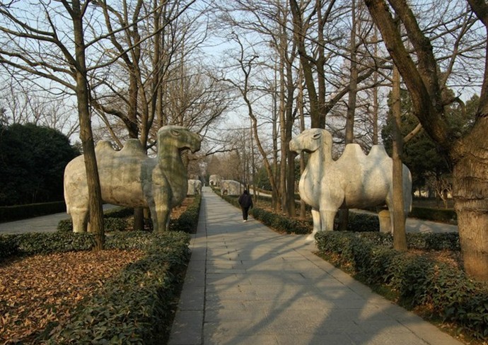 明孝陵的開(kāi)創(chuàng)性地位還體現(xiàn)在其依山勢(shì)地形蜿蜒曲折的陵墓神道。陵墓的神道從四方城開(kāi)始。四方城是一座碑亭,位于衛(wèi)橋與中山陵之間,是明成祖朱棣永樂(lè)三年(公元1405年)為其父朱元璋建的“大明孝陵神圣功德碑”。其頂部已毀,僅存方形四壁,內(nèi)有立于龜趺座上的石碑一塊,碑高8. 78米。碑文由朱棣親撰,計(jì)2746字,詳述明太祖的功德。碑座、碑額雕琢瑰麗。神道由此向西經(jīng)外金水橋(今紅橋),繞過(guò)梅花山再折向北,長(zhǎng)約1800米。其中段為石象路,這段路上相向排列著12對(duì)石獸,分別是獅、駱駝、象和馬等6種,每種兩對(duì),姿態(tài)是一對(duì)伏,一對(duì)立。后面是一對(duì)高大的華表,上雕云龍,氣勢(shì)不凡。折向北面的神道上分別列著4對(duì)身著盔甲或蟒袍的文臣武將,有些已經(jīng)損壞。石人石獸的體型都很巨大,是明代石刻的藝術(shù)珍品。南京博物院前院長(zhǎng)梁白泉研究員說(shuō):“明孝陵首開(kāi)了第一代皇帝陵寢的神道作為后世子孫陵寢共用神道的制度。神道兩邊分布的12對(duì)石像生和4對(duì)石人,石刻風(fēng)格多樣,造型厚重簡(jiǎn)樸,融整體宏大與局部精細(xì)為一體,也代表了中國(guó)明初石雕藝術(shù)的最高水平。”