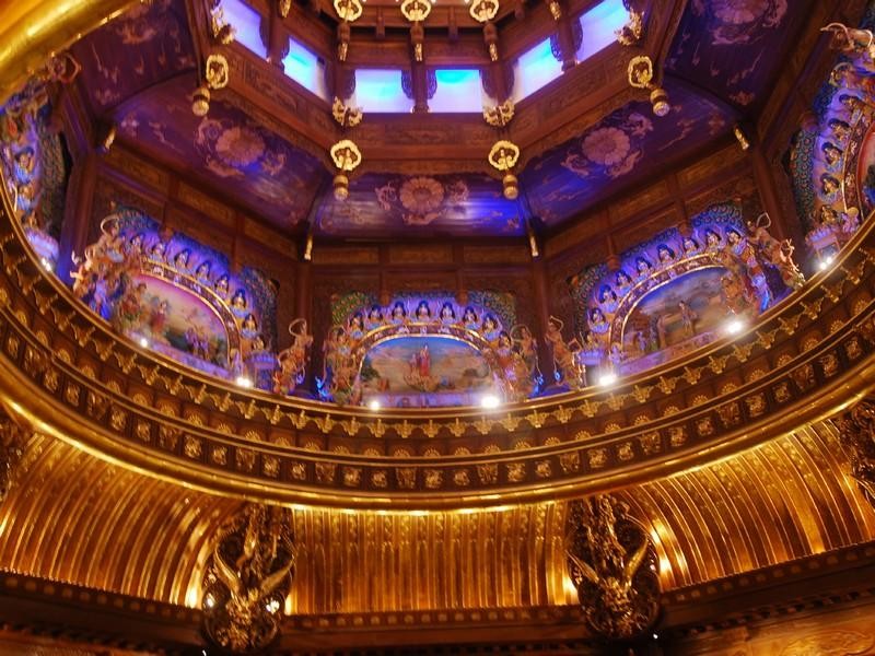 梵宮內(nèi)部各建筑空間獨(dú)立且互相貫通,由門(mén)廳、廊廳、塔廳、圣壇、三傳會(huì)議廳、千人宴會(huì)廳等組成。精雕細(xì)琢的東陽(yáng)木雕、敦煌技師的手工壁畫(huà)、光燦奪目的琉璃巨制、精致典雅的甌塑浮雕壁畫(huà)、技藝精湛的揚(yáng)州漆器、恢宏大氣的油畫(huà)組圖、古雅精麗的景泰藍(lán)須彌燈、精美的景德鎮(zhèn)青花斗彩缸……這些匯集眾多文化遺產(chǎn)、眾多藝術(shù)瑰寶的藝術(shù)珍品遍布靈山梵宮的各個(gè)區(qū)域,將優(yōu)秀的傳統(tǒng)文化演繹得淋漓盡致,令人目不暇接、回味無(wú)窮。