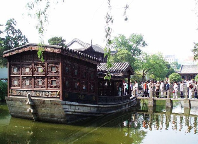 瓶形的水池是人工開鑿的,整個水池周長約1866米,面積約占全園面積的一半多。池水清澈,水池四周全部用明代城磚駁岸,顯得非常古雅。水池的南端,有一座長14.5米的仿木船式石肪。據(jù)說這座石舫是兩江總督尹繼善為了自己享樂,在清代乾隆十一年建造的。石舫上的“不系舟”匾額是當(dāng)年乾隆皇帝南巡時所題。中國有句古語: