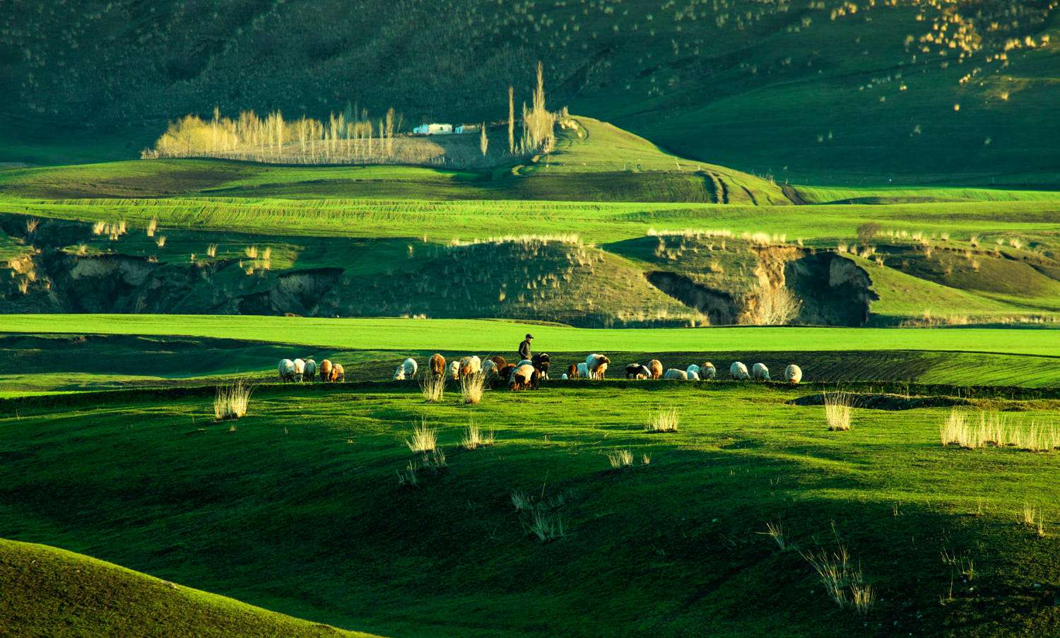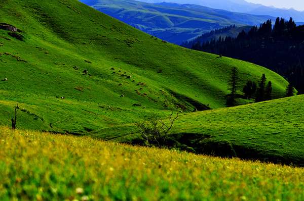 那拉提草原是發(fā)育在第3紀(jì)古洪積層上的中山地草場,東南接那拉提高嶺,勢如屏障,西北沿鞏乃斯河上游谷地斷落,地勢大面積傾斜,山泉密布,溪流縱橫。版權(quán)所有山東聊城聊之旅國際旅行社有限公司,轉(zhuǎn)載必究!緣山腳沖溝深切,河道交錯,森林茂密,莽原展緩起伏,松塔沿溝擎柱,還有氈房點點,畜群云移,是鞏乃斯草原的重要夏牧場。