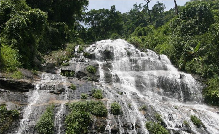登上百花嶺觀瀑亭,便可欣賞到那直瀉的飛流,猶如飄拂的銀鏈懸掛在山間,呈三級(jí)跌宕瀉下,嘩嘩作響,周圍煙籠霧繞,景色奇特而壯觀。此瀑布因百花嶺而得名,其源頭在百花嶺的海拔700米的第二峰,含納眾匯,集水面近2平方公里。溪澗兩旁長滿茂密的原始森林,地面積被層厚,地下潛流充足,長年水流不歇,流水落差達(dá)300米,地勢(shì)跌宕,遂成三級(jí)飛瀑,而且一級(jí)一個(gè)景觀,各具特色。