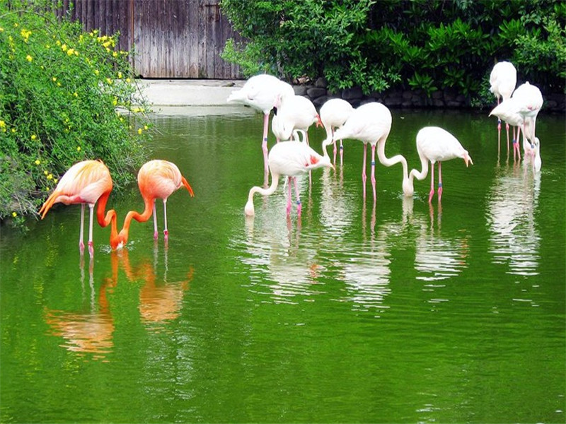 火烈鳥(niǎo)展區(qū)位于正大門(mén)口,共展出88只火烈鳥(niǎo),有迎賓小姐的美稱,紅色的是美洲火烈鳥(niǎo),粉紅色的是歐洲火烈鳥(niǎo)。它們有“Z”字形的長(zhǎng)頸和鐮刀形的長(zhǎng)嘴。此外它們還有一雙蜘蛛般的長(zhǎng)腿,顏色發(fā)紅。它們有著獨(dú)特的淡朱紅色的羽毛。遠(yuǎn)遠(yuǎn)看去宛如一團(tuán)火球。所以又有“火鶴”之稱更奇特的是無(wú)論它們的羽毛如何美麗,一經(jīng)拔下就變成白色。它們的嘴和眼也生的與眾鳥(niǎo)不同:嘴細(xì)長(zhǎng)彎曲向下,色多淡紅,基部為黃色,眼睛又細(xì)又瘦,與它們那龐大的身軀很不協(xié)調(diào)。