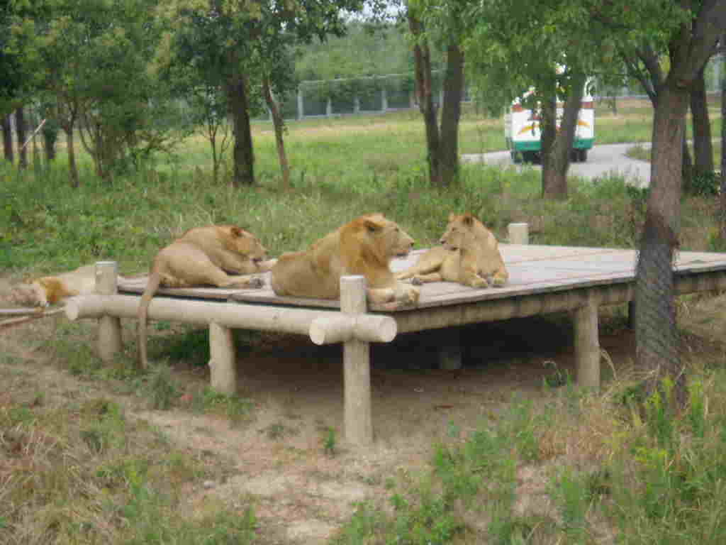 本園獅區(qū)現(xiàn)有30頭成年和14頭幼獅。展區(qū)內(nèi)你看不到動(dòng)物的籠舍,沒(méi)有都市里的喧囂與污染,也沒(méi)有水泥森林的壓迫感,只有滿目的青翠和回歸大自然的靜謐與清新。對(duì)每一位游客來(lái)說(shuō),乘坐游覽大巴,深入到食肉動(dòng)物自由出沒(méi)的原野、叢林,是一種充滿著恐懼和刺激的歷程。進(jìn)入非洲獅展區(qū),非洲獅威武的形象即刻映入眼簾,頸部與肩部披著長(zhǎng)長(zhǎng)的黑褐色鬃毛的雄獅常常有讓人心驚膽跳的感覺(jué)。