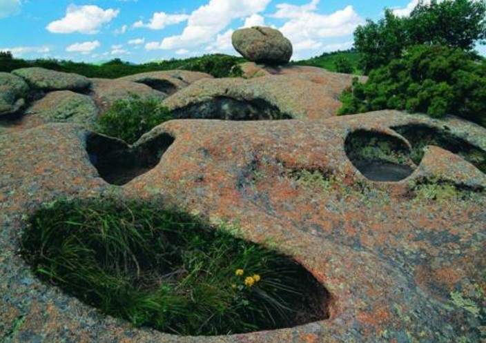 青山園區(qū)位于克什克騰地質(zhì)公園東部,包括關(guān)東車景區(qū)和青山景區(qū),面積37.13km。形成于1億多年前的花崗巖在風(fēng)蝕、重力等外力的長期作用下形成了關(guān)東車景區(qū)內(nèi)形態(tài)各異的峰林地貌,如蒼鷹、似巨龍,惟妙惟肖,神采奕奕。而在青山景區(qū)面積約1000m平緩起伏的花崗巖石面上,分布著200多個呈橢圓形、圓形或不規(guī)則半圓形的巖臼,被稱作“九缸十八鍋”。它們形狀如臼如缸、如碗如匙、如鼓如盤、如杯如桶,全面展現(xiàn)了巖臼的不同發(fā)育階段,是至今為止世界上規(guī)模最大、保存最好、類型最全的巖臼群。