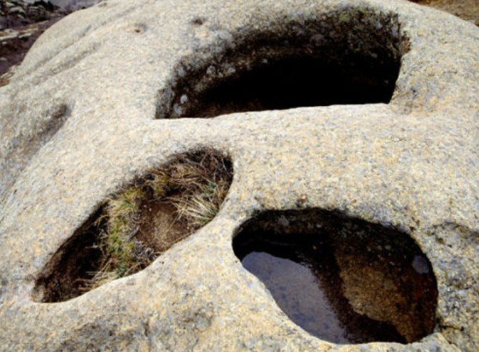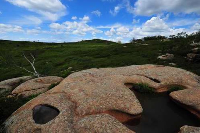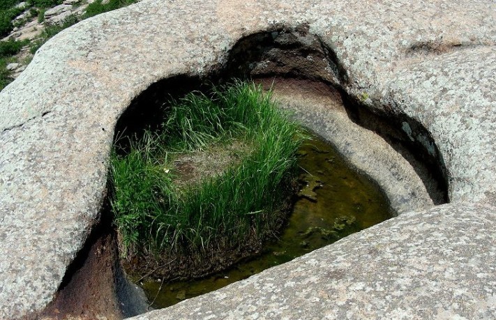 青山自然保護(hù)區(qū)位于海拔1574米的青山山體上,在山頂頂峰分布著各種各樣的冰臼,其平面上多數(shù)呈圓形、近圓形、橢圓形和不規(guī)則的形狀。有的象葫蘆,有的象梅花,有的象瓜子。一般冰臼口稍小,中下部較大,底多較平或呈鍋底微凹。形體“似臼”、“似盤”、“似盆”、“似匙”等,可以說(shuō)應(yīng)有盡有。其中較深的冰臼多呈口小、肚大和底平特征。口部上緣帶有缺口(或開口),缺口有大有小,有深有淺。一般臼口寬約0.3~2米,深0.1~2米左右。最大的直徑達(dá)10.5米,深4.5米;最小的只有幾公分,似一般鈕扣大小。據(jù)調(diào)查統(tǒng)計(jì),在方圓不到2平方公里的范圍內(nèi),就有大小不一的冰臼1000多個(gè)。有的冰臼光潔如洗,無(wú)任何殘留物和充填物,但很多冰臼中,都填滿風(fēng)塵黃土物質(zhì),已長(zhǎng)滿花、草或喬木、灌木,形成大小不同的“天然盆景”,置于堅(jiān)硬平坦的花崗巖山脊上,十分壯觀,給人極大的神奇感和奧秘感。