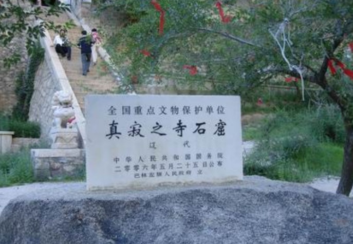 遼代石窟“真寂之寺”即林東后召廟石窟寺。其寺位于遼上京南15公里的山谷中。石窟開鑿在桃石山東南面陡壁上,分中、南、北三窟。窟前是清代續(xù)建的喇嘛廟“善福寺”。中窟眉額刻“真寂之寺”四個大字,當(dāng)為遼代開鑿石窟的題名。“真寂”二字與中中窟內(nèi)釋迦牟尼“圓寂”之意相合??邇?nèi)釋迦臥佛像周圍有佛弟子像若干,做悲哀狀。窟壁有千佛像百余尊,形象各異,南窟雕像中間為佛,騎獅子和象的文殊、普賢二菩薩分列兩邊,又有供養(yǎng)人服侍,窟門口有金剛力士像。北窟分內(nèi)外兩室,外室雕像同于南窟,內(nèi)室造像均為浮雕,有佛、弟子和供養(yǎng)人,兩側(cè)刻有胡服裝束力士像一對,頗具特色。桃石山谷口兩側(cè)緣石壁立有兩尊金剛力士浮雕,十分生動,一東一西,各自把定金剛杵,足踏耐熏二鬼,另在巖壁和巨石之上多有清代陽刻梵文:“六字真言”。“真寂之寺”附近的山谷中還有石窟若干,其中有遼史所記弘福寺及開化寺遺址,諸多跡象表明這里是遼、清兩代弘揚(yáng)佛法的對地。
