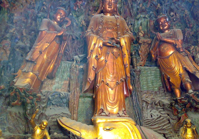 過(guò)天王殿為庭院,院中古木參天,正面是大雄寶殿,重檐高33.6米,十分雄偉。大殿正中是一座高24.8米的釋迦牟尼蓮花坐像,造像“妙相莊嚴(yán)”、“氣韻生動(dòng)”,是一件不可多得的宗教藝術(shù)作品。正殿兩邊是二十諸天立像,殿后兩邊為十二圓覺(jué)坐像。大殿后壁有“慈航普渡”、“五十三參”海島立體群塑,共有佛像150尊,正中為鰲魚觀音立像,手執(zhí)凈水瓶,普渡眾生,下塑善財(cái)童子,說(shuō)是善財(cái)童子拜觀音的故事,善財(cái)童子參拜名師53位,第27參拜見(jiàn)觀音得道成佛。觀音兩側(cè)為第子善才與龍女,上有地藏菩薩,再上面是釋迦牟尼雪山修道的場(chǎng)景:白猿獻(xiàn)果、麋鹿獻(xiàn)乳,整座佛山造型生動(dòng),很有藝術(shù)價(jià)值。