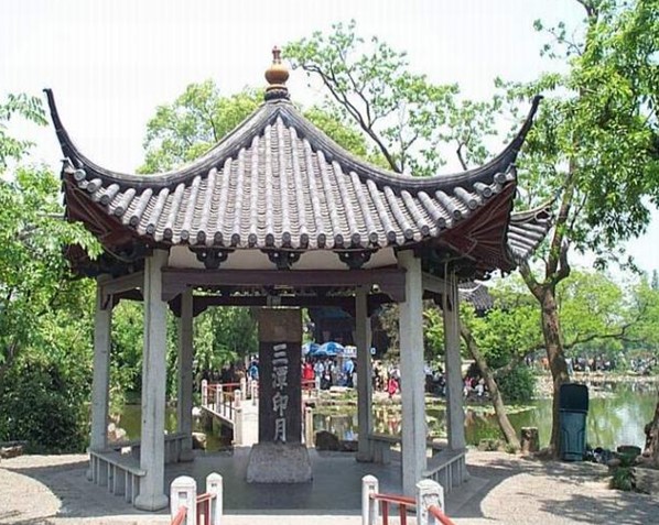 其一,所謂三潭,實(shí)際上是3個(gè)石塔和其周圍水域,石塔建于宋代元四年(公元1089年),每個(gè)高2米,分別矗立在水光瀲滟的湖面上,形成一個(gè)等邊三角形。小瀛州之南的湖面上是湖上賞月的極佳去處,水深若潭,月影幽深。