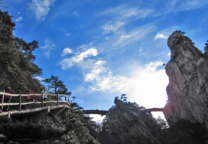 天堂寨頂峰天堂頂,海拔1729、13米,素有中原第一峰之美稱。這里,北望中原,南眺荊楚,巍巍群山盡收眼底,茫茫天地網(wǎng)絡(luò)其中,氣勢磅礴,景色壯觀。環(huán)顧四周,筆架山雄姿若隱若現(xiàn),九資河倩景如玉帶飄舞。清風(fēng)吹過,足下林海頓時泛起層層綠波,起伏跌宕,似有排山倒海之勢,響起陣陣濤聲,久久回蕩,如鼓角相聞。這里還是觀高山日出的理想佳地。晨曦初露,天宇朦朧,一輪紅日噴薄而出,霎時萬道霞光籠罩四周,萬物復(fù)蘇,百鳥齊鳴,好一幅高山日出的壯麗畫面。