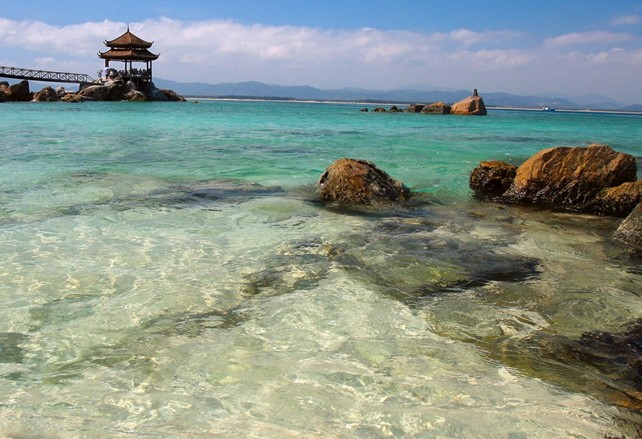 這里,崖洲灣弧弦百里、碧波萬頃,鰲山云深林翠,巖奇洞幽,遍布神工鬼斧,大小石群。山海之間宛如一副古樸優(yōu)美的山海圖畫。歷代文人騷客莫不鐘情于這一方山水。1962年郭沫若游覽“大小洞天”,對景區(qū)的山光海色贊嘆不已,在《游崖縣鰲山》一詩中譽之為“南溟奇甸”。大小洞天風景區(qū)有歷史悠久的名人勝跡。唐代高僧鑒真率日本留學僧容睿、普照及弟子祥彥、思托等35人第五次東渡日本,海上遇臺風漂流萬里至此登岸,并修造大云寺,傳播佛教文化;宋末元初女紡織家黃道婆往返與崖州灣,把先進的植棉、紡棉技術帶至中原大陸,留下千秋史話。