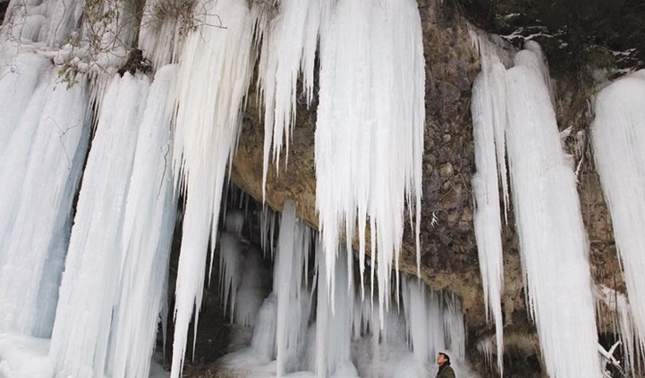 宋洛鄉(xiāng)里有一處冰洞,只要洞外自然溫度在28℃以上時(shí),洞內(nèi)就開(kāi)始結(jié)冰,山縫里的水沿洞壁滲出形成晶瑩的冰簾,向下延伸可達(dá)10余米,滴在洞底的水則結(jié)成冰柱,形態(tài)多樣,頂端一般呈蘑菇狀,而且為空心。進(jìn)入深秋時(shí)節(jié),冰就開(kāi)始融化,到了冬季,洞內(nèi)溫度就要高于洞外溫度。
