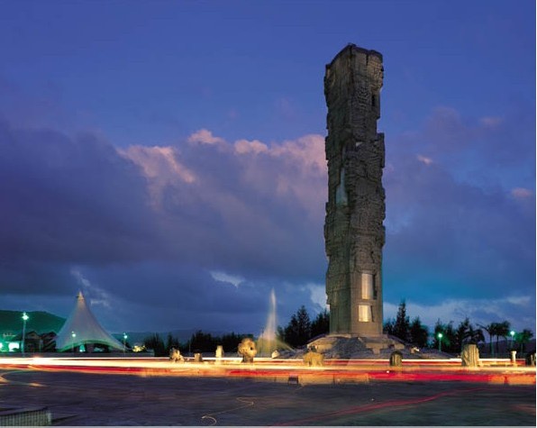 圍繞圖騰柱的中心雕塑區(qū),形成三圈石硨,氣勢宏大、形象獨(dú)特。第一圈有蒼龍、白虎、朱雀、玄武四季標(biāo)識與日晷24節(jié)氣雕塑;第二圈表現(xiàn)盤古開天地、女媧補(bǔ)天、嫦娥奔月、弄天舞干戚、大禹治水、牛郎織女、后羿射日、夸父追日等八個遠(yuǎn)古神話;第三圈是反映天文、人、動物、植物萬物生靈雕刻。圖騰柱和雕塑群渾然一體,構(gòu)成強(qiáng)烈的中國古天文意識和東方神秘色彩。廣場外圍設(shè)計的五組白色風(fēng)帆式的尖頂帳篷及大型彩色噴泉,給具有古老文化意蘊(yùn)的雕塑增添了現(xiàn)代氣息。