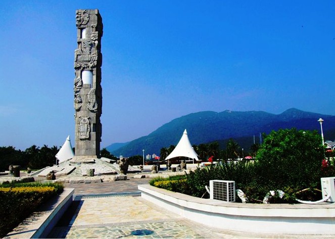 亞龍灣中心廣場,位于三亞市東南28公里處。廣場以圖騰柱向藍(lán)天升騰,以雕塑群向大地和大海延伸,其宏偉氣勢和獨(dú)特的藝術(shù)造型,以有限的藝術(shù)空間形式,引導(dǎo)我們的想象向無限的空間擴(kuò)展。屹立的圖騰柱是廣場的最高點(diǎn),高26.8米,由200多塊巨大的花崗石和直徑2.5米的鋁合金柱組成。上面雕刻有龍、鳳、太陽鳥、魚以及風(fēng)雨雷電四神的圖案。 圍繞圖騰柱的中心雕塑區(qū),形成三圈石硨,氣勢宏大、形象獨(dú)特:第一圈有蒼龍、白虎、朱雀、玄武四季標(biāo)識與日晷24節(jié)氣雕塑;第二圈表現(xiàn)盤古開天地、女媧補(bǔ)天、嫦娥奔月、弄天舞干戚、大禹治水、牛郎織女、后羿射日、夸父追日等八個遠(yuǎn)古神話;第三圈反映天文、人、動物、植物萬物生靈及八位中國古代之神。圖騰柱和雕塑群渾然一體,構(gòu)成強(qiáng)烈的中國古天文意識和東方神秘色彩。廣場外圍設(shè)計的五組白色風(fēng)帆式的尖頂帳篷及大型彩色噴泉,給具有古老文化意蘊(yùn)的雕塑增添了現(xiàn)代氣息。