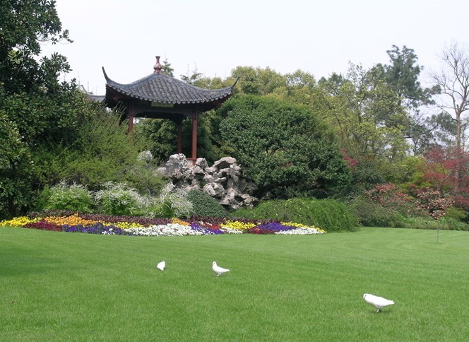 穿過竹院,繞過雪松,前面是一片大草坪。草坪周圍種填了高大挺拔的雪松和濃密常綠的廣玉蘭林帶,使之同周圍的景區(qū)分開,隔離噪聲。這種用植物來分隔空間的處理手法,突破了中國傳統(tǒng)的以墻、籬等建筑劃分空間格局的形式。草坪北臨西里湖,從這里可遠(yuǎn)望蘇堤煙柳、西山層林。運(yùn)用借景手法,突破了有限的園界,伸展了園林景色。草坪西側(cè),種植了一棵紅杉樹,紅杉是美國前總統(tǒng)尼克松于1972年訪華時贈給我國的禮物,周總理決定把紅杉樹苗種在杭州,花港的這一棵,是經(jīng)培育后為紀(jì)念周總理而栽種的。