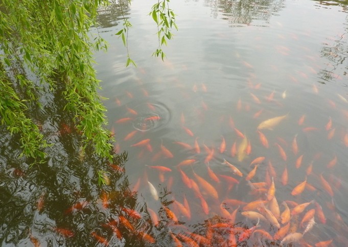 還有種說法:“花港觀魚”四字為清康熙皇帝手跡。康熙一生崇信佛教,向有“佛爺”、“善人”之稱。他孫子乾隆爺也崇尚“好生之德”。然而,在漢字里,三點(diǎn)為水,四點(diǎn)為火。繁體“魚”字底部的四點(diǎn),本為火字,魚遇水而生,遇火必死。皇帝不忍見魚死,便將碑文中“魚”字底部的四點(diǎn)改寫成了三點(diǎn),意在讓魚永遠(yuǎn)歡快地生活在水里,以示皇恩浩蕩,澤被萬物之意。這也給后人留下了一段有趣的典故。