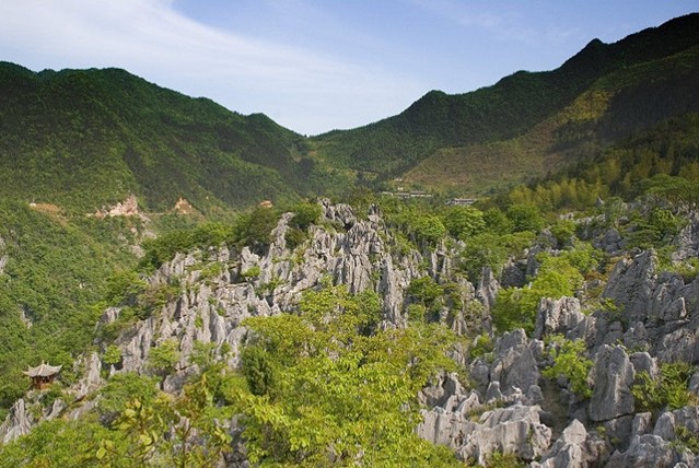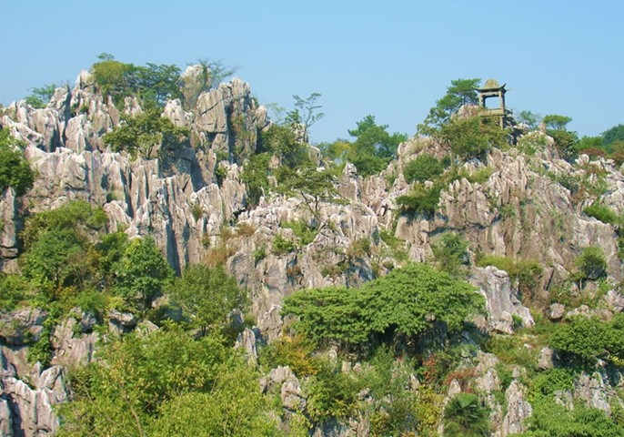 千島湖石林景區(qū)面積20平方公里,是中國四大石林之一。它位于杭州地區(qū)西邊的淳安縣千島湖,其面積之廣,規(guī)模之大,景觀之奇在華東地區(qū)堪稱一絕,被稱為“華東第一石林”。千島湖石林是一個迷宮式的溶巖地貌景觀,由藍玉坪、玳瑁嶺、西山坪組成。區(qū)內群峰壁立,層巒疊嶂,石壁、石柱、石筍、石洞等體態(tài)紛呈,各具特色,有“華東第一石林”的美譽。是我國四大石林之一(另三大石林為云南路南石林,四川興文石林,福建大湖石林)。千島湖石林主要有藍玉坪、玳瑁嶺和西山坪三處。這里海拔650余米,古時這里稱“白云山”。在這崇山峻嶺間,常有云霧茶的產地。這片石林屬迷宮式喀斯特地貌,石峰峭立,千姿百態(tài),峰回路轉。或泉聲叮當,或山窮水盡,或豁然開朗,或茫然不知所歸。大自然的造化真是奇特,有的移步換峰形,有的一巖多景,鬼斧神工,妙趣橫生。