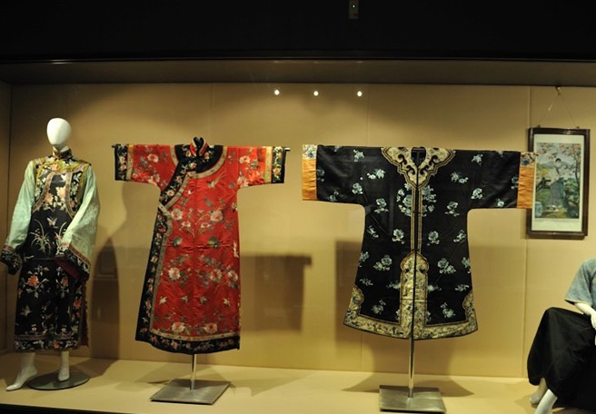 分“遵神循禮——錦衣繡服——家常日用”三部分,以絲綢服飾與歷代微縮服裝人物模型、圖板、象征性復(fù)原場景相結(jié)合的形式,形象地詮釋絲綢在古代社會的功用,展現(xiàn)戰(zhàn)國至清代流行的襖裙袍服、補服、龍袍等宮廷華服和家常日用繡品。