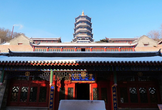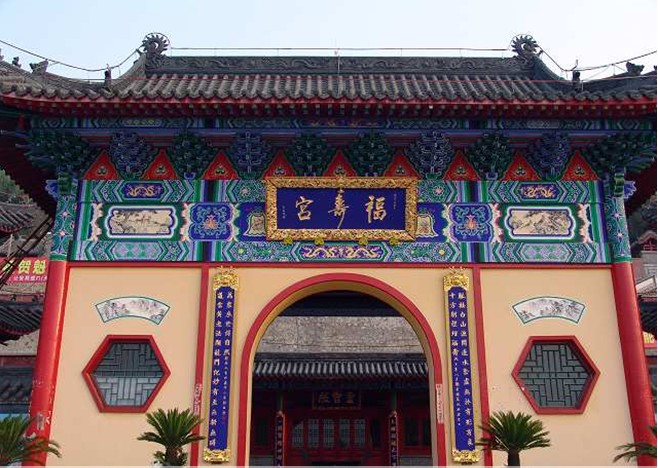 第一層為山門,建有馬殿。青石臺基,“福壽宮”匾額高懸。殿內(nèi)有彩塑紅白二馬,經(jīng)左右青龍白虎兩個配門踏甬道進入二層大殿。左右鐘鼓二樓。正殿關(guān)岳殿,正中關(guān)公神像,前供岳飛神位。殿內(nèi)東為龍王神像,西為財神。版權(quán)所有山東聊城聊之旅國際旅行社有限公司,轉(zhuǎn)載必究!東配殿為兩仙堂,內(nèi)供紀仙、柳仙。大殿東西各有配房五間,東為講經(jīng)堂,西為大仙堂。第三層為三座大殿。中為碧霞宮,東殿為呂祖殿,西殿為大仙堂。第四層?xùn)|西二大殿,東殿為三宮殿,西殿為娘娘殿。最頂一層為三清殿。