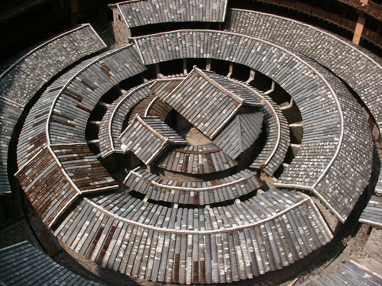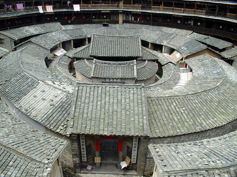 圓形土樓是客家民居的典范,它就像地下冒出來的“蘑菇”,又如同自天而降的“飛碟”,圓樓都由二三圈組成,由內(nèi)到外,環(huán)環(huán)相套,外圈高十余米,四層,有一二百個(gè)房間,一層是廚房和餐廳,二層是倉庫,三、四層是臥室;二圈兩層有幾十個(gè)房間,一般是客房,當(dāng)中一間是祖堂,是居住在樓內(nèi)的幾百人舉行婚喪和慶典的場(chǎng)所。樓內(nèi)還有水井、浴室、磨房等設(shè)施。土樓采用當(dāng)?shù)厣梁恢?,不需鋼筋水泥,墻的基礎(chǔ)寬達(dá)三米,底層墻厚1.5米,向上依次縮小,頂層墻厚不小于0.9米。沿圓形外墻用木板分隔成許多房間,其內(nèi)側(cè)為走廊。