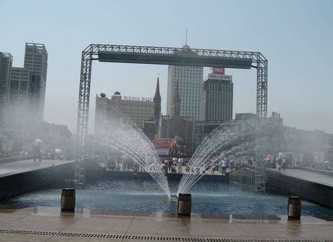 進入廣場后跨過二座平行的小橋,便是亞洲最大的音樂噴泉和超大水幕電影。總投資4000萬元的水景系統(tǒng)呈“L”型,總長200米,主噴泉長達95米,與廣場的中心舞臺遙相呼應,主噴泉的核心是兩座橋之間的號稱“擎天柱”的噴泉,中心的一支大口徑的噴嘴射出直徑達38毫米的水柱,噴高可達40米,形成一柱擎天之勢;整個音樂噴泉有2000個噴嘴,400多臺水泵,全部由電腦控制,采用目前國際上最先進的高壓氣泵式激光音樂噴泉技術,噴泉在激光和音樂的配合下,能高速噴出一個個晶瑩透亮的水柱、水花、能組合出令人眼花繚亂的“高崗花式”、“華爾茲花式”、“蝴蝶展翅式”等幾百種噴泉花式,形成一個美不勝收的“水世界”;同時與噴泉交相輝映的水燈也大放異彩,隨著音樂的變化,一個赤橙黃綠青藍紫的“水光舞臺”,通透明亮,宛如仙境,令人目不暇接,贊嘆不已。在廣場的兩側,噴射的水墻組成一個高20米,寬60米的扇形水幕,對面的建筑上射過來的一道光束和激光投射在晶瑩透明的水幕上,水珠如霰如霧,色彩斑斕的光束與水幕交相輝映,形成一組組生動活潑的畫面——這就是天一廣場的大屏幕水幕電影,巨大的水幕電影中景觀人像清晰可感,恍如夢境,又仿佛觸手可及,令人驚奇。