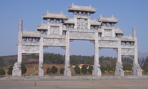 “古隆中”石牌坊高約六米,長(zhǎng)約十米,其建造材料為青石開榫組裝而成,依外觀形式為柱不出頭有樓,四柱三牌樓式。“古隆中”牌坊寬三間,中為中間,兩旁為次間,四柱腳深埋土中,四周出土處鋪地平石,柱前后及旁,以十個(gè)紋頭砷石支撐。牌坊定盤枋斗口架正昂板,兩正昂間置花板,并雕流空花紋,以為裝飾。正昂上平鋪脊筒檐板,其檐板叉出發(fā)戧,戧角作鴿尾形。牌坊脊板兩端并飾魚龍吻,中央置火焰珠。
