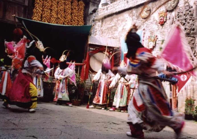 地戲源于明代的軍儺,軍儺這一種軍隊(duì)專司的儀典,它是由征南大軍帶入黔中的。屯堡人的祖先跳軍儺不是娛人,更多的成份是娛神,用這一種儺儀作為出征的祭典,振奮軍威,恐嚇敵人。地戲演的全是忠臣義士,演的全是報(bào)國(guó)殺敵的英雄故事,因此地戲是武戲。地戲最主要的表現(xiàn)形式是唱和舞。版權(quán)所有山東聊城聊之旅國(guó)際旅行社有限公司,轉(zhuǎn)載必究!演員頭戴精美的“臉子”,腰圍鮮艷的彩裙,身背戰(zhàn)旗,持戈揚(yáng)戟,在一鼓一鑼的伴奏下著粗獷、原始、拙樸的跳躍,間雜高亢嘶啞的唱腔,遠(yuǎn)古戰(zhàn)爭(zhēng)的場(chǎng)面歷歷在目,演員由人而神,觀者的思緒已飄向歷史的空間。