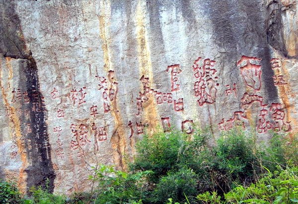 在長10米、高6米的范圍內(nèi),有一片奇特的用鐵紅色顏料書寫的古文字,文字大小不一,大者如人,小者如斗,非鑿非刻,似篆非篆,神秘莫測。當(dāng)?shù)匕傩辗Q之為“紅崖天書”。近百年來,“紅崖天書”引起了眾多中外學(xué)者的研究興趣,曾有“諸葛碑”、“古彝文”、“自然石花”等推斷,甚至有人推測這是外星人留下的遺跡。據(jù)說郭沫若、丁文江等著名學(xué)者也曾嘗試破譯,但一直沒有定論?!?/p>