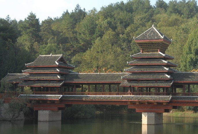 風(fēng)雨撟極富民族特色,也是侗寨特有的建筑之一。因撟上建有廊和亭,即可行人,又可避風(fēng)雨,故稱風(fēng)雨撟。坐落在廣西三江林溪河上的程陽(yáng)撟是風(fēng)雨撟的代表。這座撟始建於1916年,是一座四孔五墩伸臂木梁撟,全長(zhǎng)76米,寬3.4米,高10.6米。在5座青石撟墩上,架四五尺圍大的6根連排杉木兩層為梁,上面以5座不同屋頂?shù)臉情w相間,接連構(gòu)成一條長(zhǎng)廊式走道撟面,走道兩旁設(shè)長(zhǎng)凳,供行人避雨和休息,樓閣和廊檐繪精美侗族圖案。五個(gè)石墩上各筑有寶塔形和宮殿形的撟亭,逶迤交錯(cuò),氣勢(shì)雄渾。