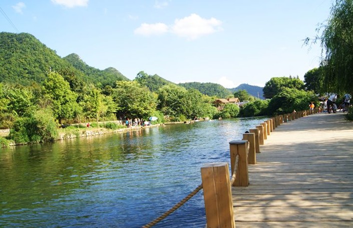 ?。?)螃蟹井—穆家壩河灘景觀:該景觀以彎曲河道水面為主體,其間具有賓館,螃蟹井、村寨、孤丘組景。該景觀的原始風(fēng)貌獨具一格,河水碧綠迂回,兩岸秀山并列,山澗螃蟹井水流涓涓,農(nóng)田稻花滾滾,苗圃翠新,大有“穿花復(fù)繞水,隔岸聞花香”風(fēng)光。版權(quán)所有山東聊城聊之旅國際旅行社有限公司,轉(zhuǎn)載必究!在吉林賓館一帶。更是綠樹成蔭,草坪蔥蔥,姐妹峰則是古藤繞崖,螃蟹井布依農(nóng)舍更反映了布依山寨特色。