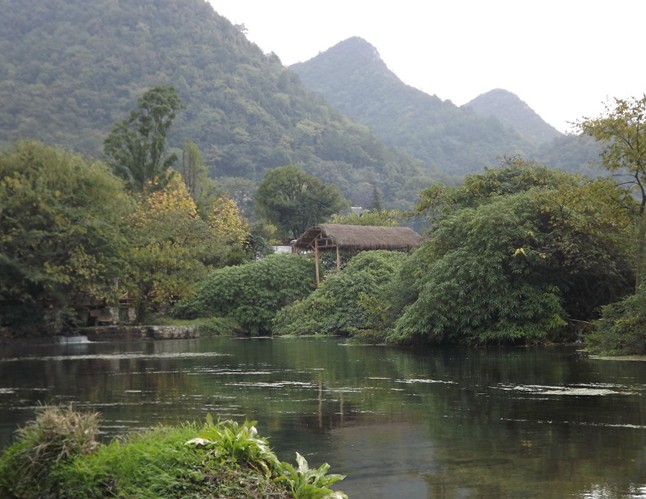 (2)上水河灘景觀:該景觀由蛇狀河曲、河牛2個小島及1個大島、水輾、小橋、上水村寨、孤丘組成。河曲竹木夾巖,綠島相間,上水村依山面水,孤丘(比高40米)屹立河畔,其襯景、對景效果好。