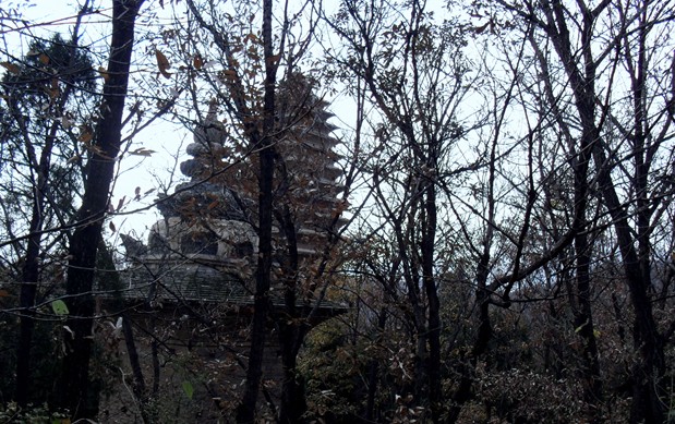 位于法王寺后山坡上,15級(jí)方形磚塔,高約40米,周長(zhǎng)28米,塔體壁厚2.13米,黃泥砌縫,外涂白灰。塔身密檐層層外迭,迭出塔身最寬者約90厘米。另外,塔身的高度和寬度由下而上遞減,呈拋物線形。塔南面辟一塔門,可直入塔心室。塔心室為方形,上部是空心建筑,從底層可視塔頂。塔心室內(nèi)供漢白玉佛像一尊,是明代永樂(lè)七年(1409年)九月,周王為生子所送,稱南無(wú)阿彌陀佛,玉佛之右下角和雙手已殘損。