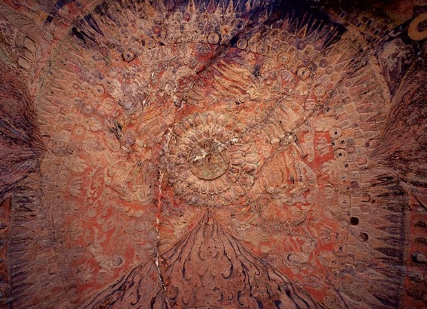 景明元年至正光四年(公元500-523)營造,洞窟平面呈馬蹄形,穹隆頂,深12米,寬10.90米,高9.3米,正壁雕主佛釋迦牟尼坐像及二弟子、二菩薩,南北壁均一立佛二菩薩。佛、菩薩體態(tài)修長,表情溫和,神采飄逸,是北魏晚期風行的“秀骨輕像”的典型代表。地面刻蓮花圖案裝飾,示意蓮花寶池??唔斨虚g浮雕一朵盛開的大蓮花。版權(quán)所有山東聊城聊之旅國際旅行社有限公司,轉(zhuǎn)載必究!周圍有八身伎樂和兩身供養(yǎng)天,加之流蘇帷幔構(gòu)成一蓮花寶蓋。前壁有維摩詰變相、太子舍身飼虎圖,須達那太子施舍圖和皇后、皇帝禮佛圖(已被盜走)等大型浮雕圖像及十神王像。1978年為保護洞窟雕刻拆除磚卷門洞。使鮮為人知的四頭四臂、一頭四臂護法天重見天日。