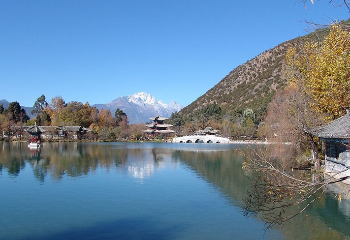 麗江黑龍?zhí)豆珗@俗稱龍王廟,位于麗江古城北端象山之麓。黑龍?zhí)秲?nèi)隨勢(shì)錯(cuò)落的古建筑有龍神祠、得月樓、鎖翠橋、玉皇閣和后來遷建于此的原明代芝山福國(guó)寺解脫林門樓、五鳳樓,原知府衙署的明代光碧樓及清代聽鸝榭、一文亭、文明坊等建筑。